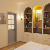 Every detail in this bedroom is a quiet dialogue between comfort and sophistication. The palette of soft neutrals, accentuated by bespoke woodwork and classic wall panelling, evokes timeless elegance.